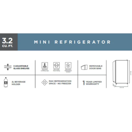 The Vissani 3.2 cu. ft. Mini Refrigerator has the storage options you’re looking for. It is a freezer-less design which allows for more usable fresh food and drink storage capacity. The sleek appearance is matched by its well-designed interior, which includes a can holder to conveniently keep canned beverages in the door, while additional door shelves provide space for other frequently used items. Its glass shelves are easy to clean, and the ENERGY STAR certified design helps save on energy costs without sacrificing performance. Perfect compact size for use in dorm rooms, offices, basements, rec/playrooms, break rooms.